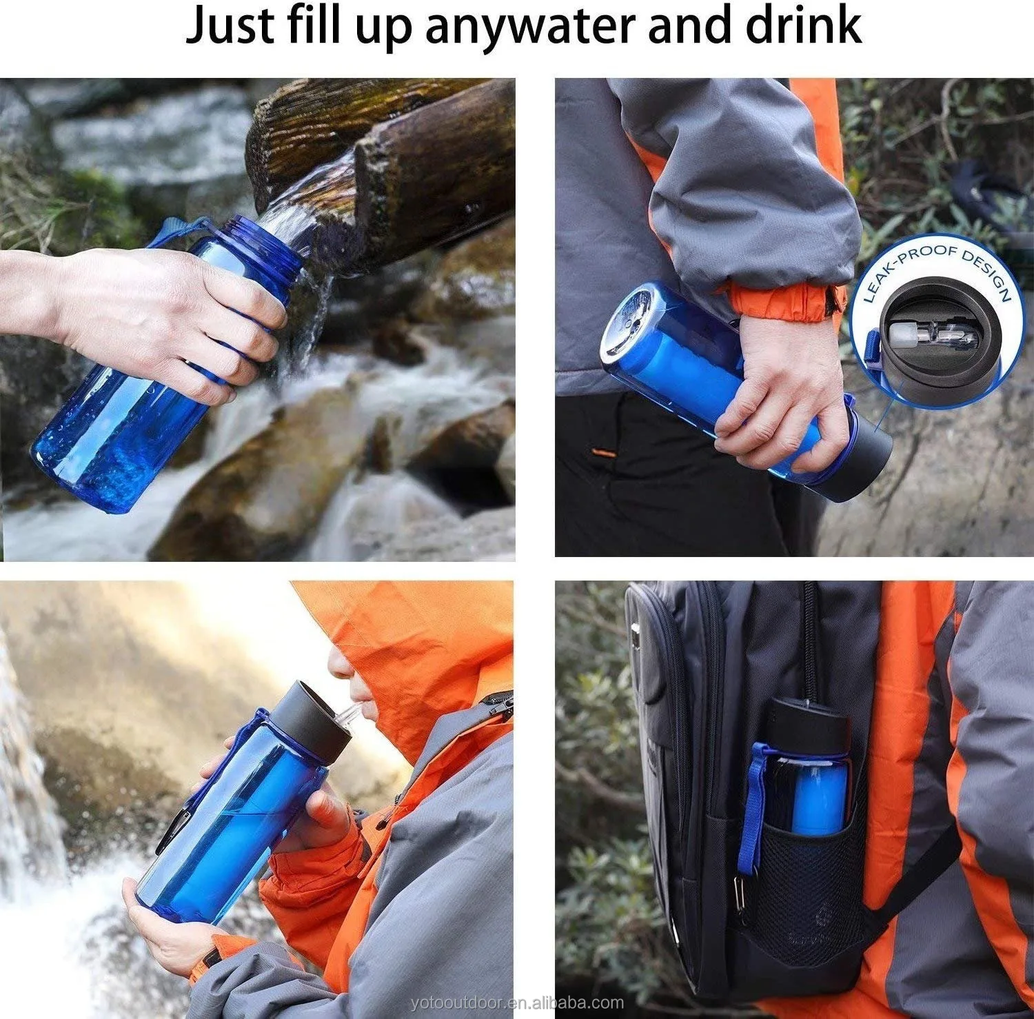 Botella de agua portátil de tritán sin BPA con filtro OEM para supervivencia al aire libre y aventuras