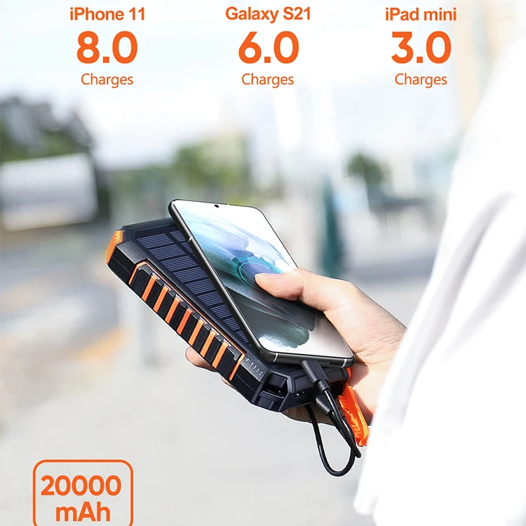 Product Features & Advantage: 1)- High Quality Battery: High quality grade A Li-polymer Battery have steady performance, it has no change within 300 times cycle charging. 2)- Safety Quality: Over current/Over power/Over voltage/Restore/over-temperature/Short circuit/Electromagnetic/Over discharge/Overcharge protection to provide security for daily use. 3)- High Speed Current Charging: 2 USB A ports and 1 USB C port, support 3A current, Wireless Charging, it can charge 4 devices at the same time. 4)- 20000mAh Real High Capacity. 5)- Single Solar Panel Solar Charging/Wireless Charging 5W 6)- 3 Charging Port: 1 USB C In/Output Port, 2 USB Output Ports. 7)- LED Flashlight Mode: Steady Mode/SOS Mode/Strobe Mode 8)- High Quality ABS+PC V0 Fire Rating+Silicone Materials