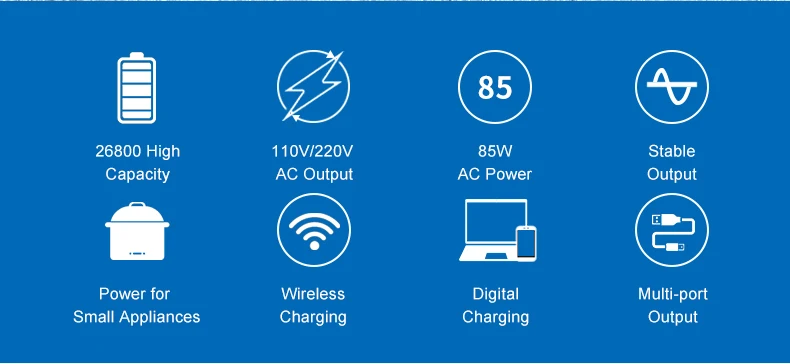 AC power bank has advanced security features • Electronic overload protection with automatic shutdown • Low battery voltage shutdown • High / low voltage automatic shutdown protection • Over heat protection and automatic shutdown • Output short circuit protection • Standby time off • Maximum voltage limit for over-charging protection • Charging timing / temperature protection